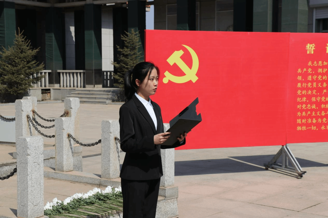 学生党员代表自博231胡峥艳、学生团员代表测控221王金杏分别带领党员、团员重温入党、入团誓词,师生们举起右拳,分别面向革命烈士纪念馆庄严宣誓,铿锵有力的入党、入团誓词响彻革命烈士纪念馆上空。