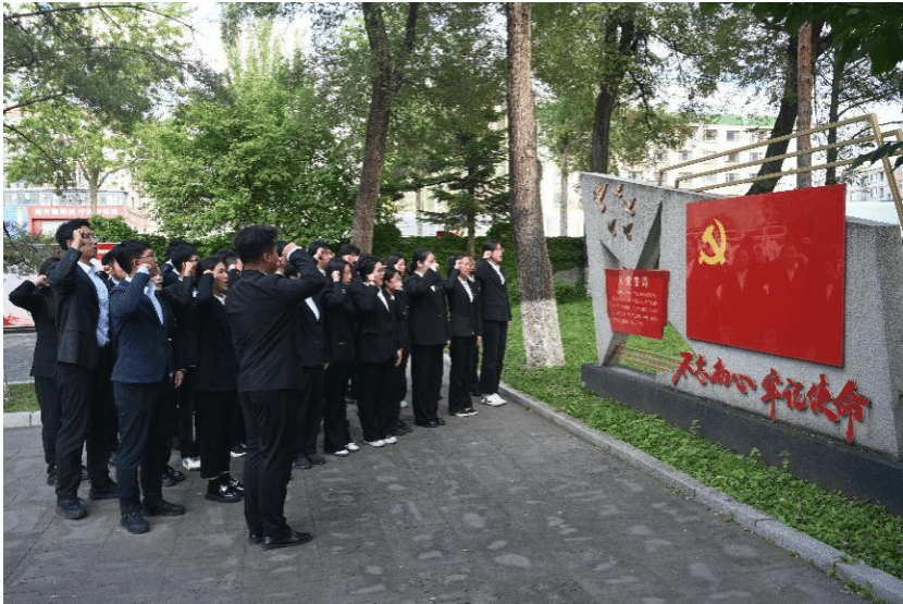 缅怀致敬英烈,赓续精神血脉。在长春南大营旧址陈列馆,团队认真观看历史实物、影像资料与场景复原,聆听抗日军民浴血奋战的感人事迹。四位成员朗诵《白山黑水间的不灭火种》,抒发对革命先烈的崇高敬意。全体成员整齐列队,向英烈鞠躬献花,面对党旗重温入党誓词,誓言铿锵,久久回荡。成员曹颖、高宇现场讲解南大营历史,使同学们深刻体悟抗联将士的英勇与坚韧,理解抗战精神在新时代的重要意义。